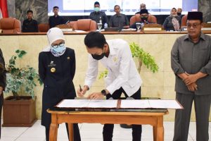 Lebak (tajukbanten.co.id) – Bupati Lebak Iti Octavia Jayabaya menandatangani Nota Kesepakatan Kebijakan Umum Anggaran (KUA) dan Prioritas Plafon Anggaran Sementara (PPAS) APBD Kabupaten Lebak Tahun Anggaran 2023 yang telah disetujui bersama oleh Dewan Perwakilan Rakyat Daerah (DPRD) Kab. Lebak pada Rapat Paripurna Dewan. Bertempat di RR Paripurna DPRD Lebak, Senin (8/8/2022).