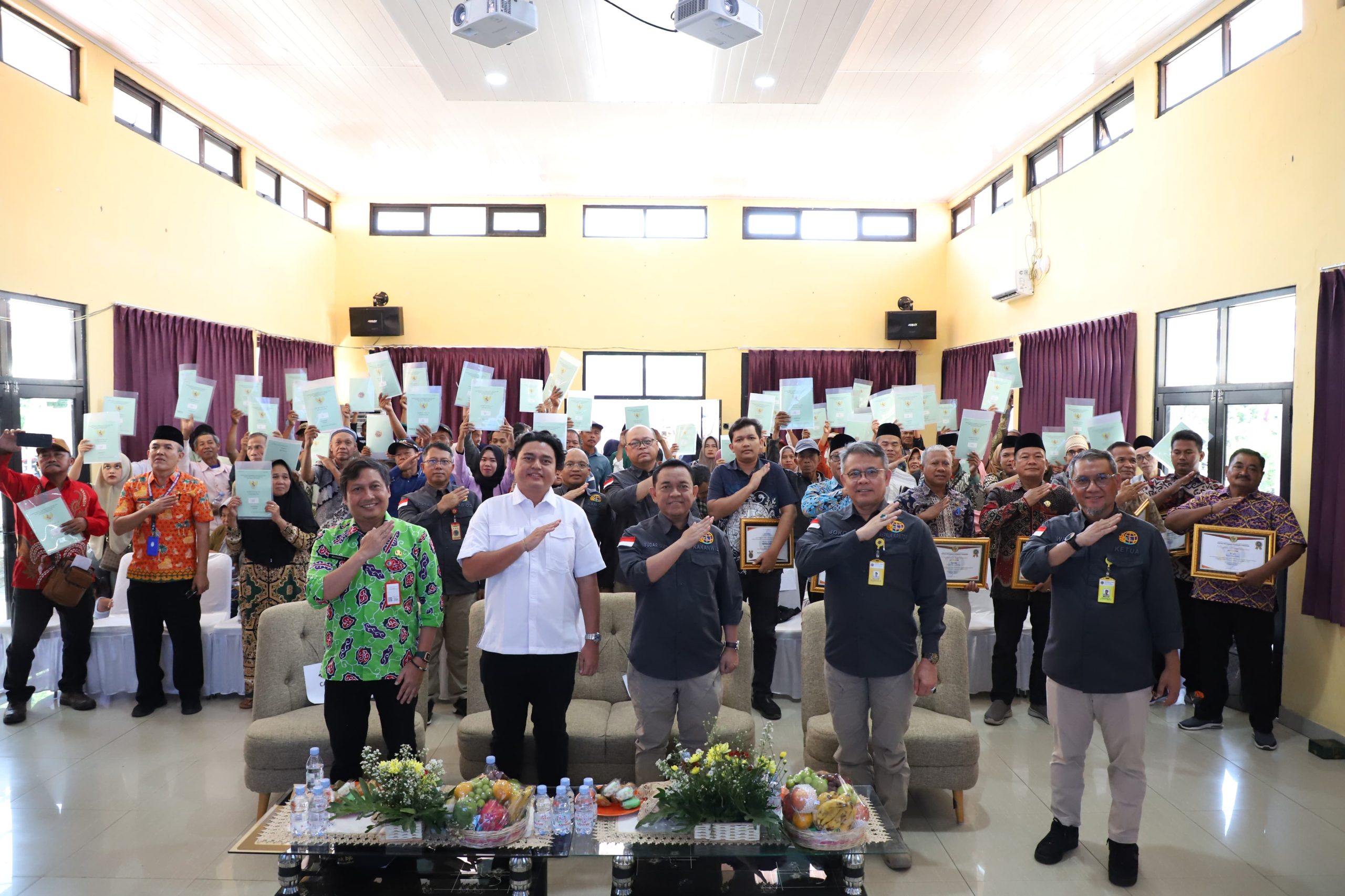 Sertipikat diserahkan langsung oleh Kepala Kantor Wilayah BPN Provinsi Banten Sudaryanto, Staf Khusus Wakil Menteri ATR/Kepala BPN Mikhail Gorbachev, Kepala Kantor Pertanahan (Kantah) Kabupaten Tangerang Joko Susanto, dan Ketua Ajudikasi PTSL Kantah Kabupaten Tangerang kepada 10 (sepuluh) orang penerima sertipikat simbolis, Kamis (21/12/2023) di Kantor Kecamatan Jambe, Kabupaten Tangerang, Provinsi Banten.
