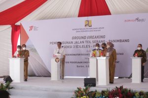 Pandeglang (tajukbanten.co.id) – Menteri Koordinator Bidang Kemaritiman dan Investasi (Menko Marves) Luhut Binsar Pandjaitan bersama Menteri Pekerjaan Umum dan Perumahan Rakyat (PUPR) Basuki Hadimuljono didampingi Pj.Gubernur Banten Al Muktabar beserta Bupati Pandeglang Irna Narulita meresmikan ground breaking pembangunan jalan Tol Serang- Panimbang seksi 3 ruas Cileles – Panimbang, Senin (8/8/2022) bertempat di pintu exit tol Panimbang.