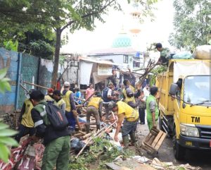 Tak hanya petugas, alat berat pun dikerahkan untuk penertiban, pengangkutan, dan pembersihan pada bangunan-bangunan semi permanen yang didirikan para PKL di sepanjang Kali Sipon.