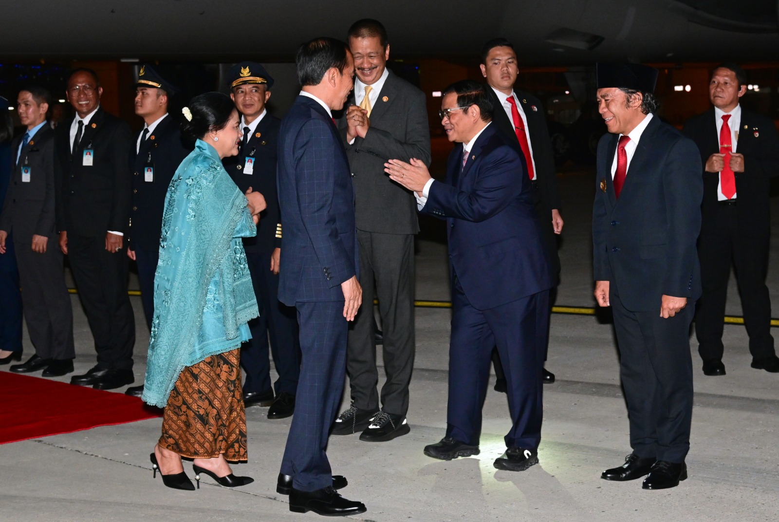 Di bawah tangga pesawat, selain Al Muktabar, tampak menyambut Presiden dan rombongan Sekretaris Kabinet Pramono Anung, Kepala Staf Umum TNI Letjen Bambang Ismawan, Dan Wakil Kepala Kepolisian Negara Komjen Agus Andrianto.