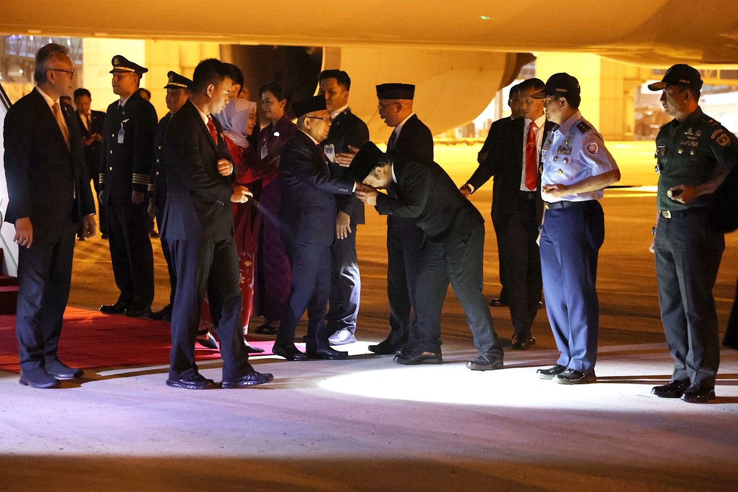 Mendampingi Wapres dalam rombongan pesawat, di antaranya Kepala Sekretariat Wapres Ahmad Erani Yustika; Direktur Jenderal Protokol dan Konsuler/Kepala Protokol Negara, Kementerian Luar Negeri Andy Rachmianto; Deputi Bidang Dukungan Kebijakan Ekonomi dan Peningkatan Daya Saing Guntur Iman Nefianto; Deputi Bidang Administrasi Sapto Harjono Wahjoe Sedjati; Staf Khusus Wapres Mohamad Nasir, Masduki Baidlowi, dan Satya Arinanto; serta TIm Ahli Wapres Nurdin Tampubolon, Johan Tedja Surya, Farhat Brachma, dan Iggi Haruman Achsien.