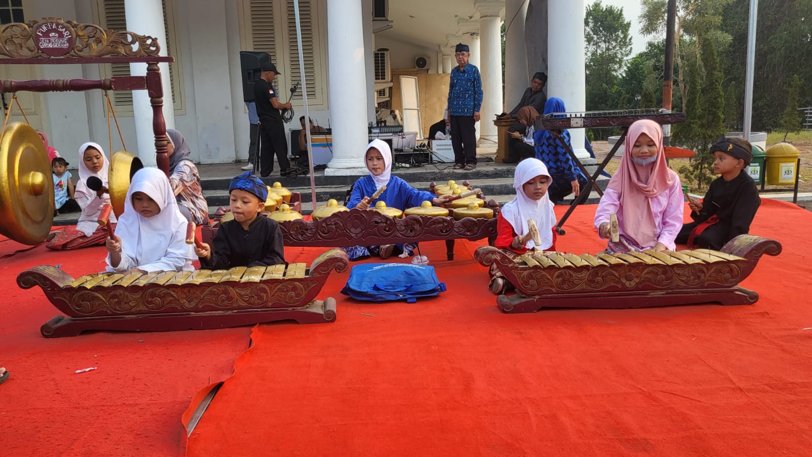 Paguyuban Sumedang Larang (PSL) Banten menampilkan seni tradisi Sunda Degung yang dibawakan anak-anak usia sekolah dasar pada acara Rabegan program Paguyuban Pasundan Wilayah Provinsi Banten, di Halaman Gedung Juang 1945 samping Alun-alun Kota Serang, Jumat (27/10/2023. Upaya menanamkan seni tradisi kepada generasi milenial.