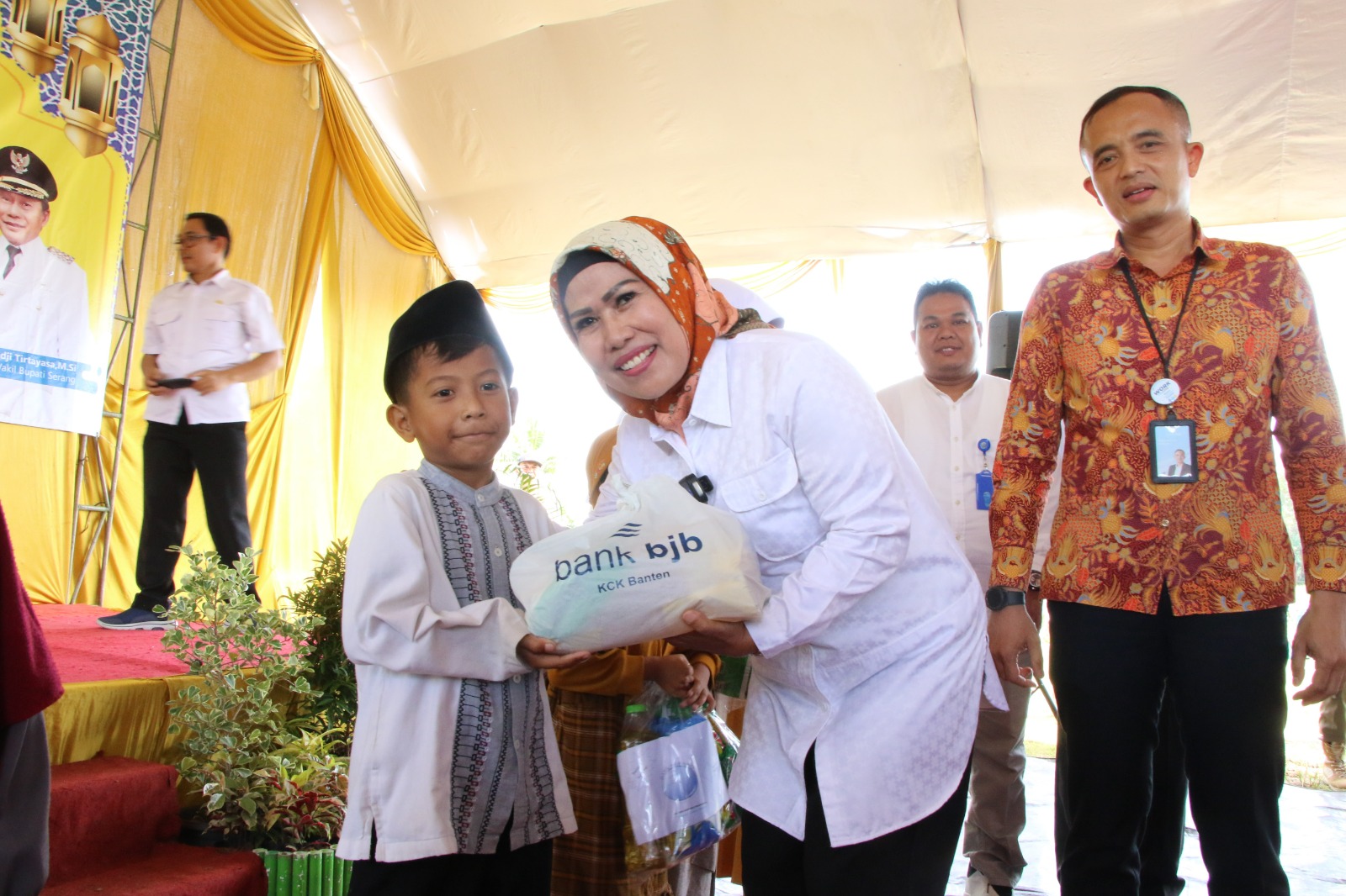 Pada bazar murah ramadhan juga dilakukan penyerahan bantuan ratusan paket sembako secara simbolis kepada anak yatim dan kaum dhuafa dari Bank Bjb KCK Banten dan Bank Serang (Red).