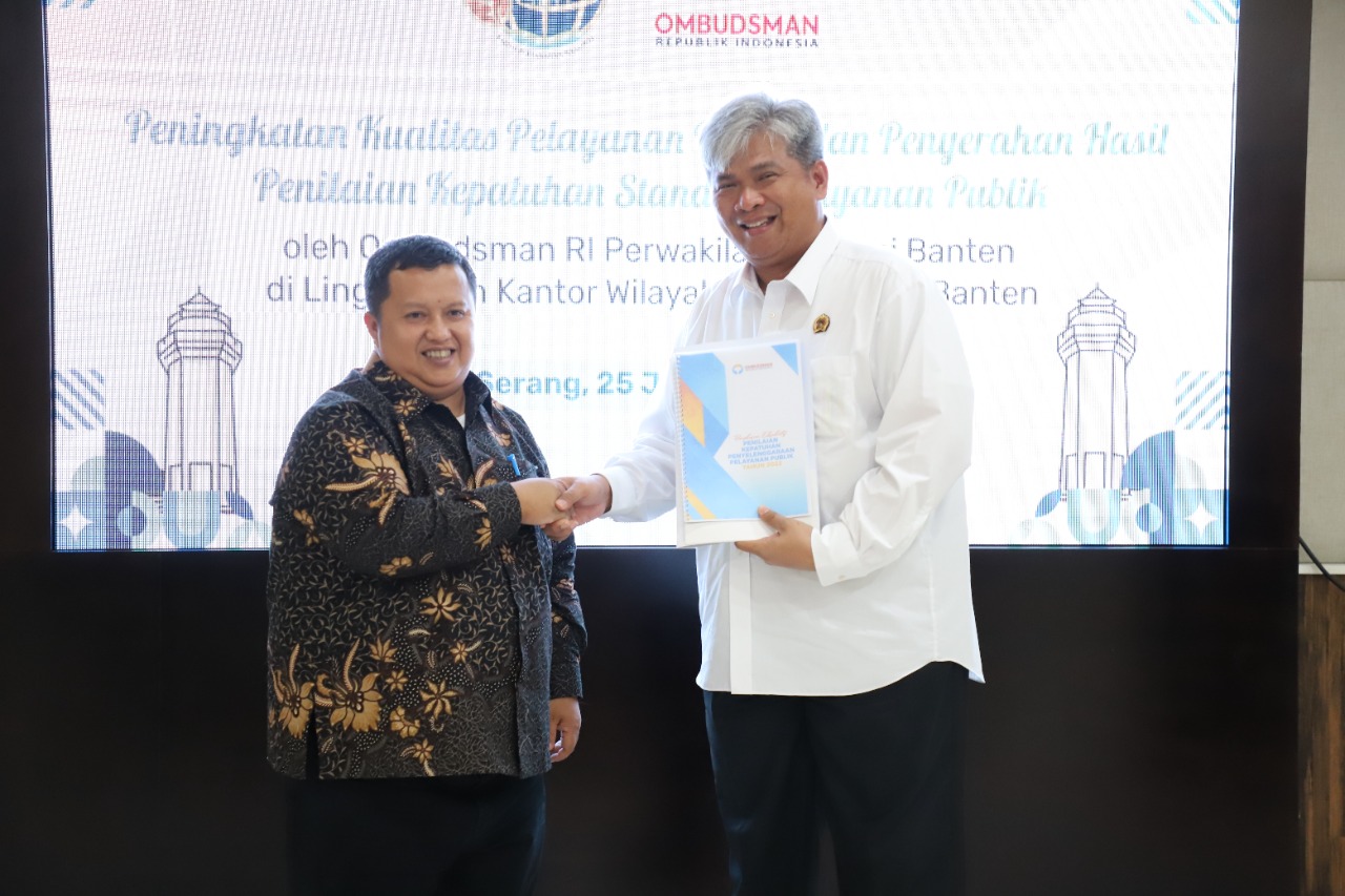 SERANG (tajukbanten.co.id) – Kantor Pertanahan di Provinsi Banten menerima hasil Penilaian Kepatuhan Standar Pelayanan Publik Tahun 2022 dari Ombudsman Republik Indonesia (ORI) Perwakilan Provinsi Banten pada Rabu (25/1/2023).